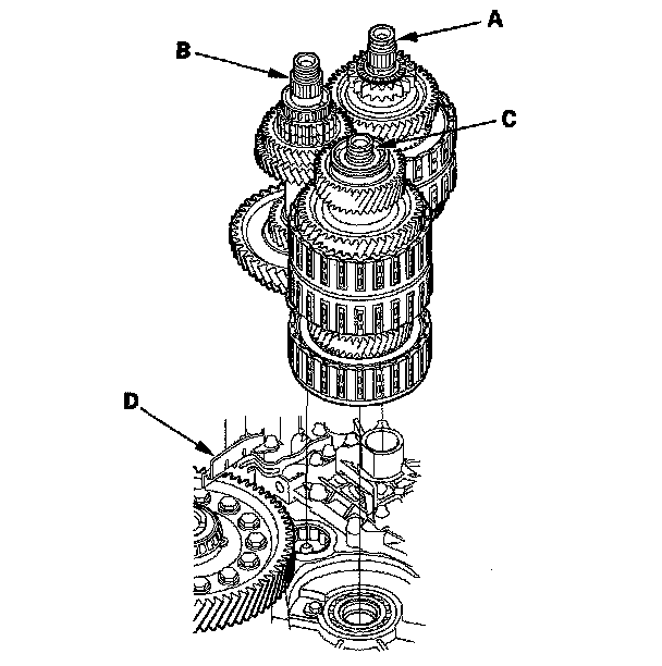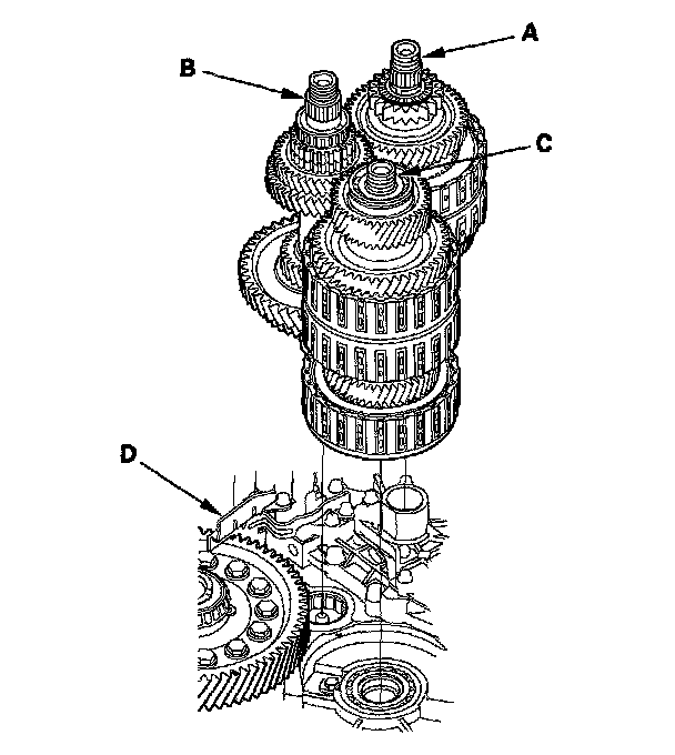 4. Join the mainshaft subassembly (A), countershaft subassembly (B), and secondary shaft subassembly (C) together, and install them in the torque converter housing. Do not bump the countershaft on the baffle plate (D).
