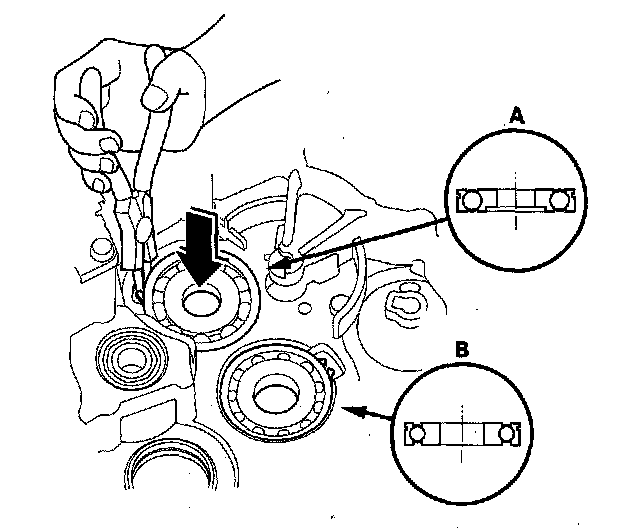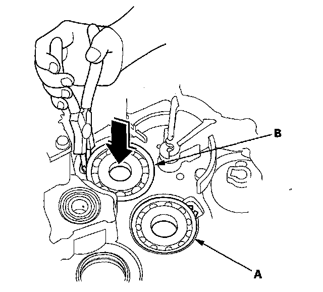 2. To remove the mainshaft bearing (A) and countershaft bearing (B) from the transmission housing, expand each snap ring with the snap ring pliers, then push the bearing out.
