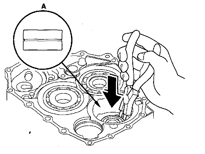 4. Expand the snap ring of the idler gear shaft (A) with the snap ring pliers, and install the bearing partway into the housing.
