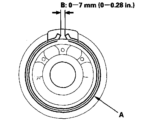 18. Verify that the secondary shaft bearing snap ring (A) is seated in the bearing and housing groove, and check that the ring end gap (B) is 0-7 mm (0-0.28 in.)