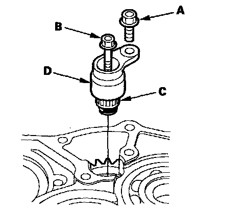 2. Install a 5 x 0.8 mm bolt (B) in the reverse idler gear shaft, and pull it to remove the reverse idler gear shaft (C) and gear shaft holder (D) together.
