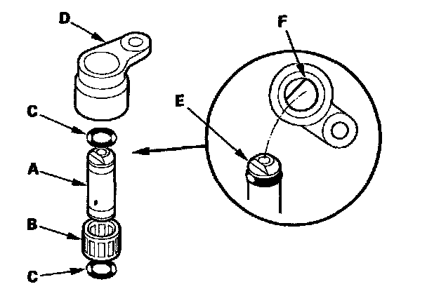 3. Assemble the new O-rings and needle bearing on the reverse idler gear shaft, then install the reverse idler gear shaft in the reverse idler gear shaft holder (D). Align the D-shaped cut out (E) of the shaft with the D-shaped area (F) of the holder.