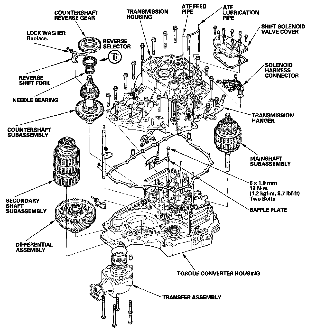 NOTE: The illustration shows the 4WD transmission; the 2WD does not have the transfer assembly.
