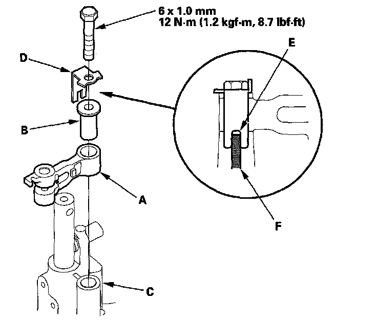 6. If the detent arm was removed, install the detent arm (A) with arm collar (B) on the servo body (C), and install the new lock washer (D) by aligning its cutout (E) with the projection (F) of the servo body. Install and tighten the bolt, then bend the lock tab of the lock washer against the bolt head.