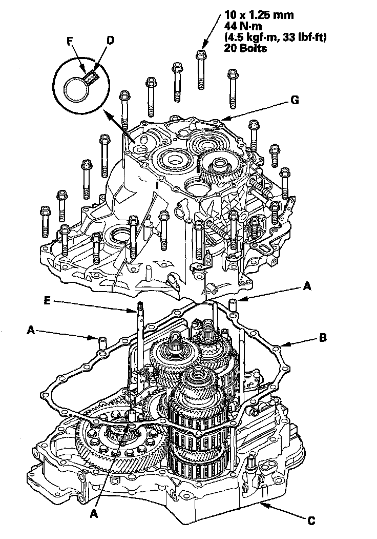 19. Install the transmission housing mounting bolts (20 bolts) along with the transmission hanger and harness clamp brackets. Tighten the mounting bolts to 44 N-m (4.5 kgf-m, 33 lbf-ft) in two or more steps in a crisscross pattern.