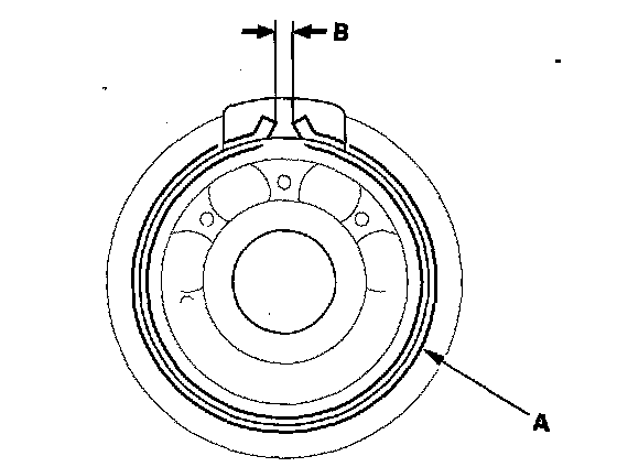 6. After installing the bearings verify that the snap rings (A) are seated in the bearing and housing grooves, and that the ring end gaps (B) are correct.