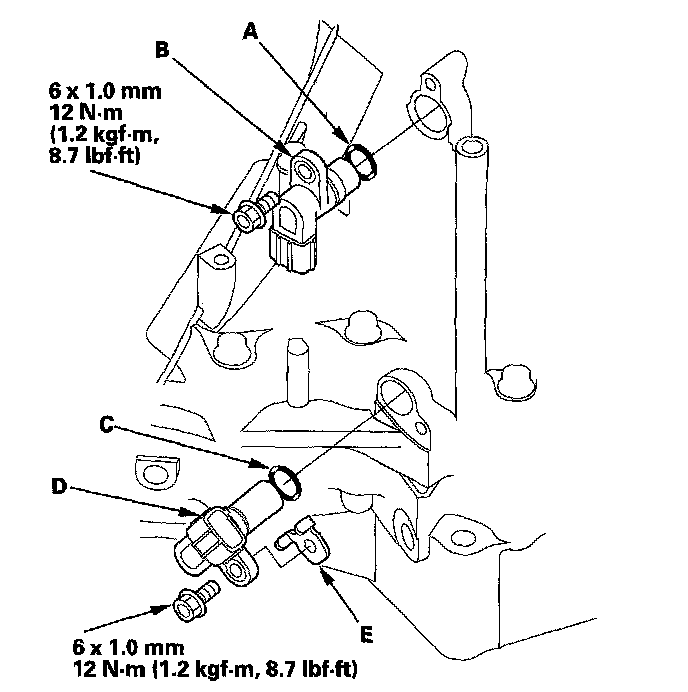 21. Install the new O-ring (C) on the output shaft (countershaft) speed sensor (D), and install the output shaft (countershaft) speed sensor and sensor washer (E).