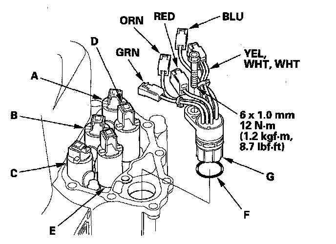 22. Install the new O-ring (F) on the shift solenoid harness connector (G), and install the shift solenoid harness connector in the transmission housing.