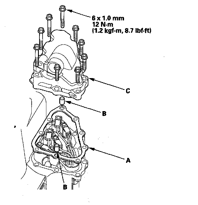 24. Install the new gasket (A), dowel pins (B), and shift solenoid valve cover (C), and secure the cover with the bolts.