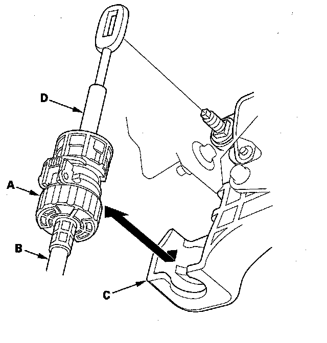 6. Lower the socket holder (A), then slide it to remove the shift cable (B) from the shift cable bracket (C). Do not remove the shift cable by pulling the shift cable guide (D).