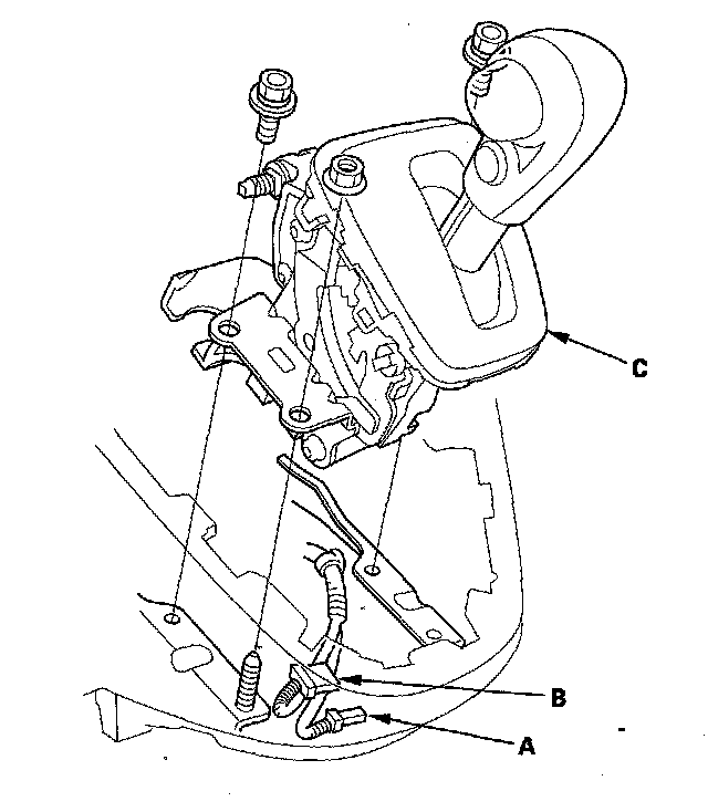 9. Disconnect the shift lock solenoid connector (A) and D3 switch/park pin switch/A/T Gear Position indicator panel light connector (B), and remove the shift lever assembly (C).