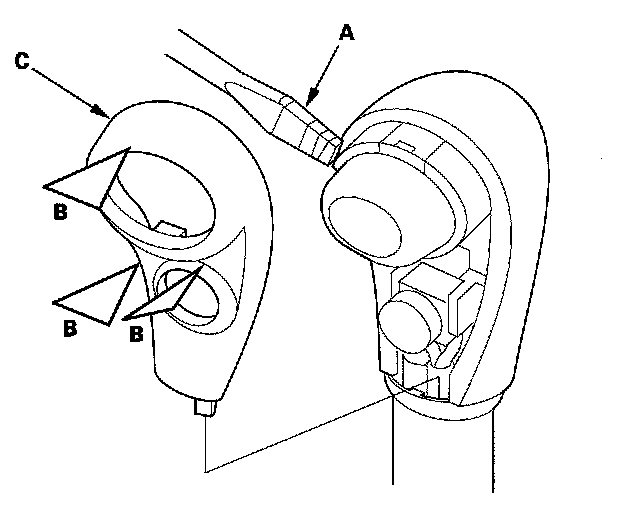 11. Apply silicone grease to the top of the shift lever rod (A), to the shift lever button spring (B), and to the area of the shift lever button (C) connected with the shift lever rod.