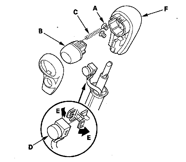 4. Remove the D3 switch (D) by expanding its locks (E) from the shift lever knob, and remove the shift lever knob (F).