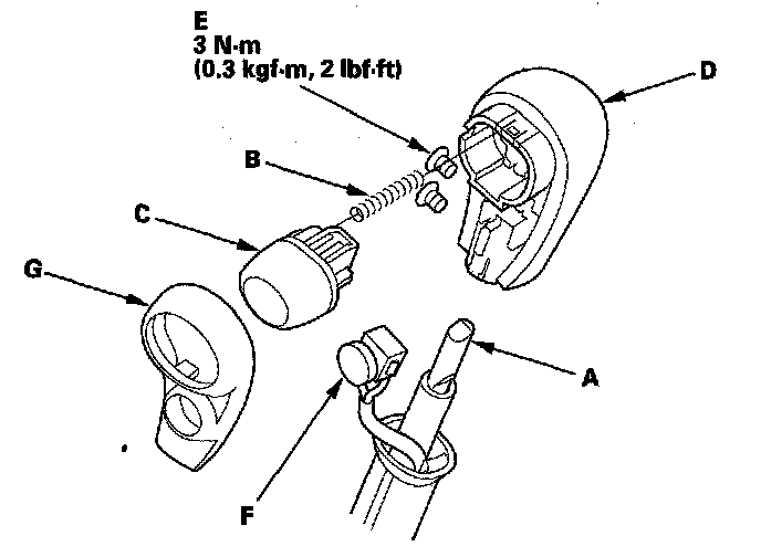 14. Install the D3 switch (F) and shift lever knob cover (G) on the shift lever knob.