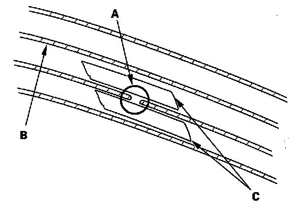 2. Carefully mask above and below the broken portion of the defogger wire (B) with cellophane tape (C).