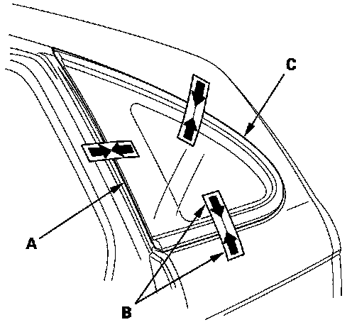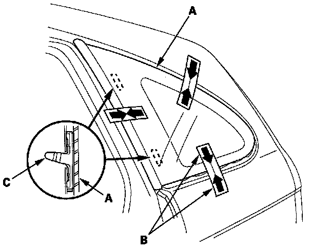 13. Set the quarter glass (A) in the opening, and make alignment marks (B) across the quarter glass and body with a grease pencil at the three points shown. Make sure both clips (C) contact with the edge of the body holes. Be careful not to touch the glass where adhesive will be applied.