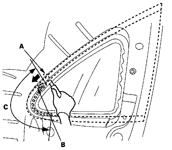 19. Put the cartridge in a caulking gun, and run a bead of adhesive (A) around the edge of the quarter glass (B) and along the front seal (C) as shown. With the printed dots on the quarter glass as a guide, apply the adhesive to the rear corner, upper corner and lower corner portions of the quarter glass. Apply the adhesive within 30 minutes after applying the glass primer. Make a slightly thicker bead at each corner.
