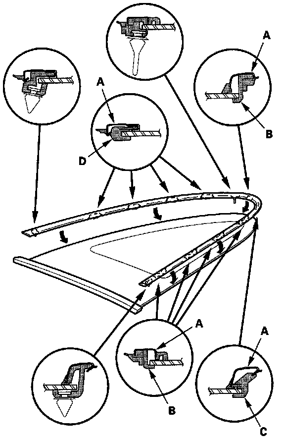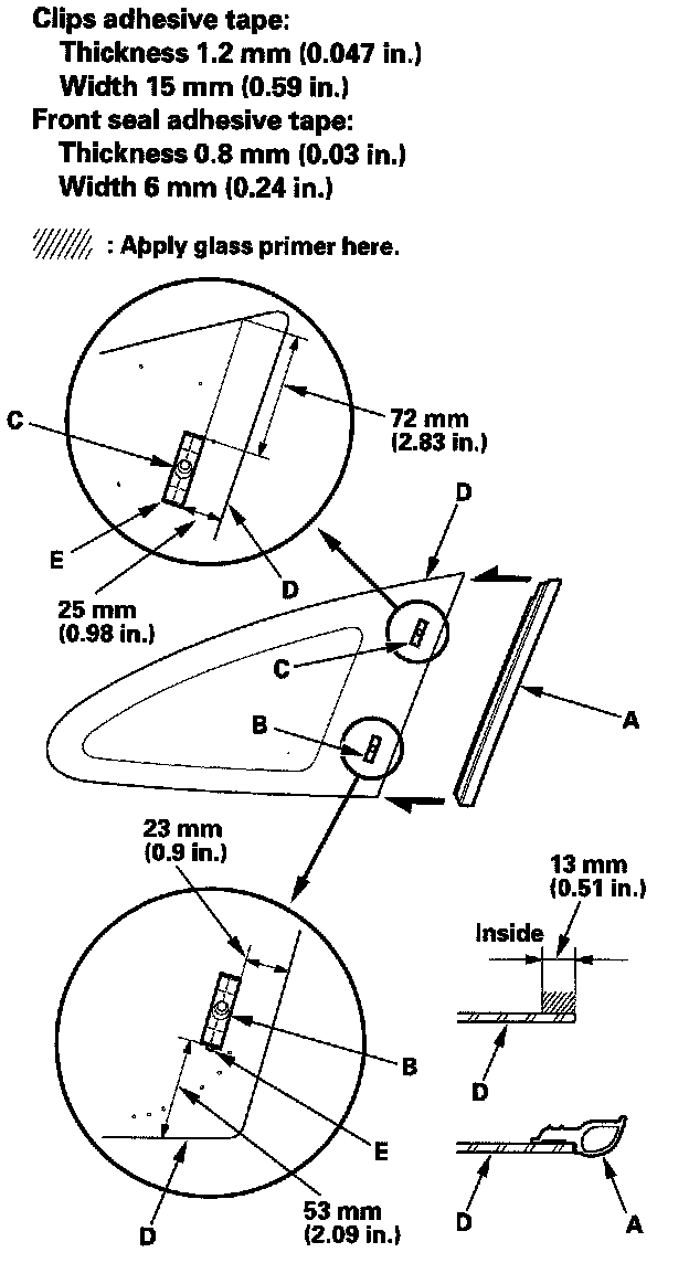 12. Attach the front seal (A), lower clip (B), and upper clip (C) with adhesive tapes to the inside face of the quarter glass (D) as shown. Before installing the front seal, apply primer to the inside face of the quarter glass.