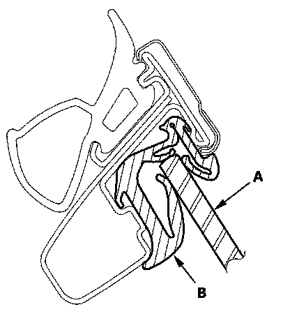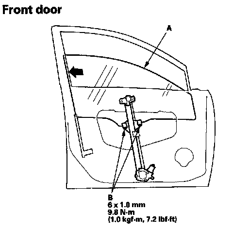 6. Raise the glass fully, and check for gaps. Also check that the glass (A) contacts the glass run channel (B) evenly.