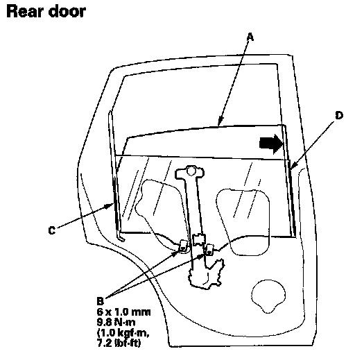 Rear: Push the glass against the front lower channel (D), then tighten the glass mounting bolts.