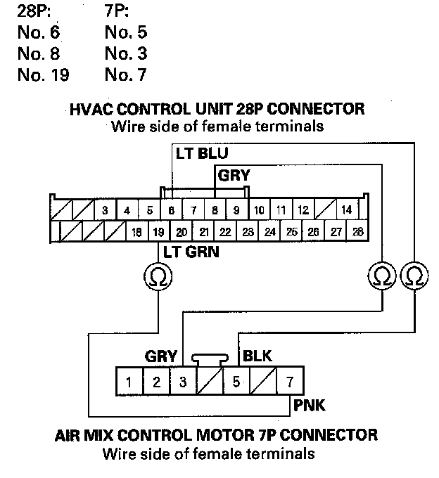 10. Check for continuity between the given terminals of the HVAC control unit 28P connector and the air mix control motor 7P connector.