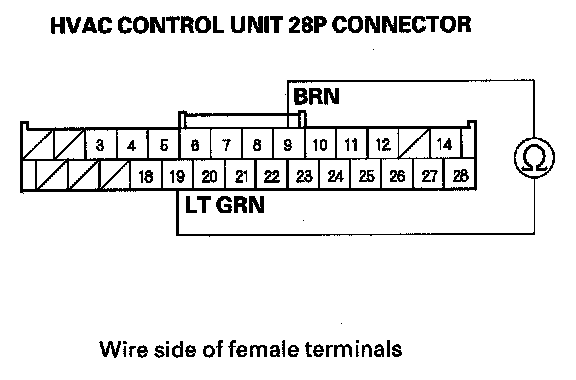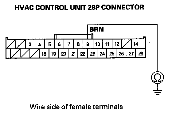 7. Check for continuity between body ground and the HVAC control unit 28P connector terminal No.9.