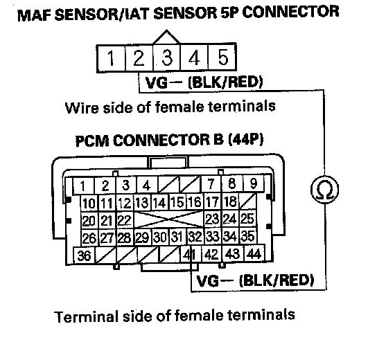 7. Check for continuity between MAF sensor/IAT sensor 5P connector terminal No. 2 and PCM connector terminal B32.