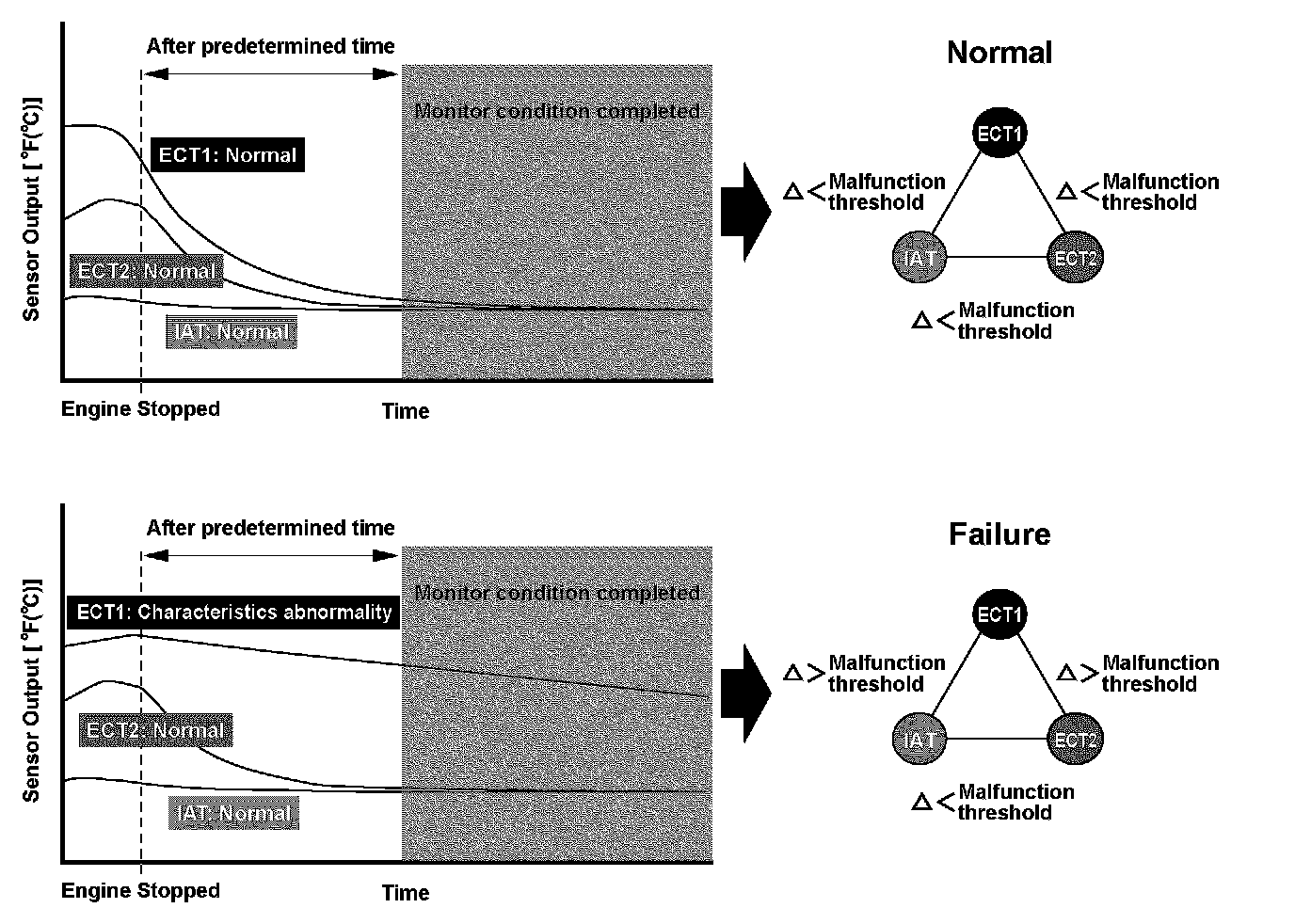 When the engine is stopped and enough time has passed, the temperature of the engine will equal the ambient temperature. When an inappropriate temperature is detected after comparing the temperature readings of each sensor, a Malfunction in the corresponding sensor is detected and a DTC is stored.