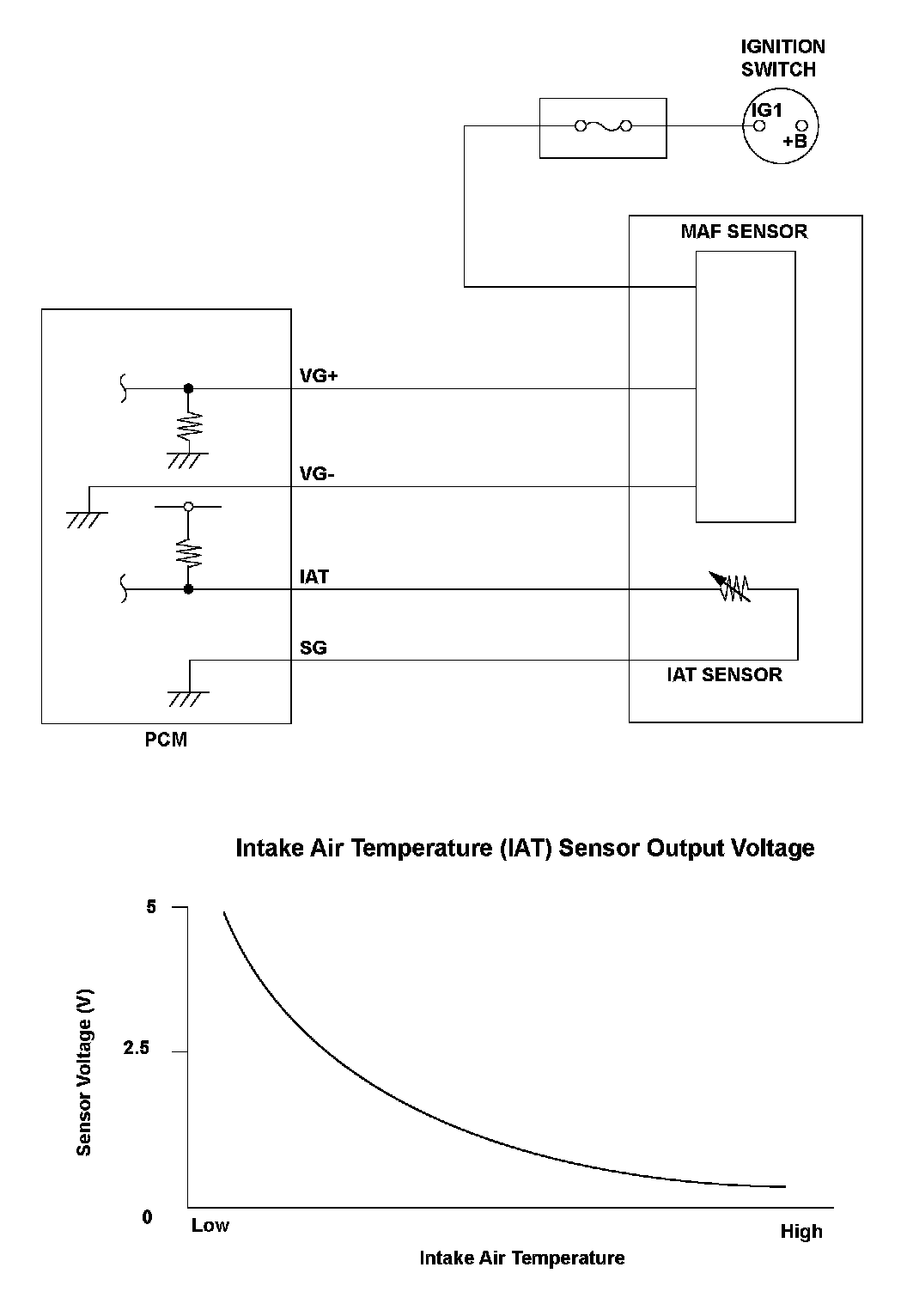 The IAT sensor resistance varies depending on temperature. The output voltage and the sensor resistance increase as the intake air temperature decreases. Conversely, the output voltage and the sensor resistance decrease as the intake air temperature increases. If the IAT sensor output voltage is excessively high, the power train control module (PCM) detects a Malfunction and a DTC is stored.