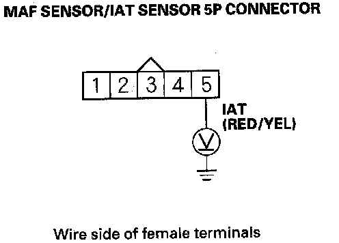 11. Measure voltage between MAF sensor/IAT sensor 5P connector terminal No. 5 and body ground.
