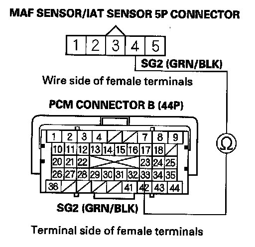 15. Check for continuity between MAF sensor/IAT sensor 5P connector terminal No. 4 and PCM connector terminal B33.