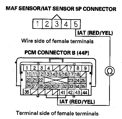 19. Check for continuity between MAF sensor/IAT sensor 5P connector terminal No. 5 and PCM connector terminal B31.