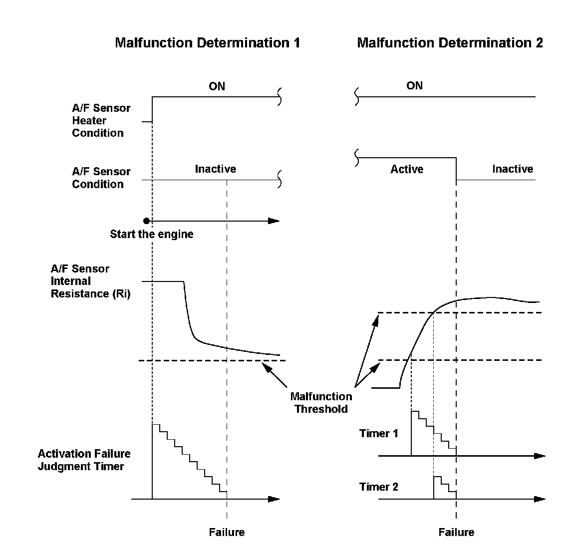 Because the degree of effect on engine control differs according to the A/F sensor internal resistance, there are two Malfunction detection threshold levels. When either one is reached, a Malfunction is detected.