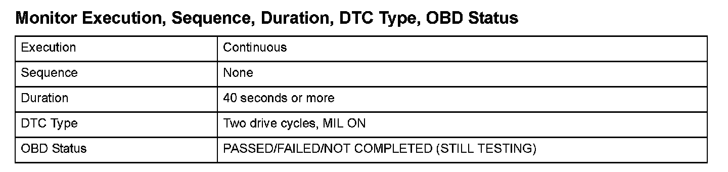 Monitor Execution, Sequence, Duration, DTC Type, OBD Status