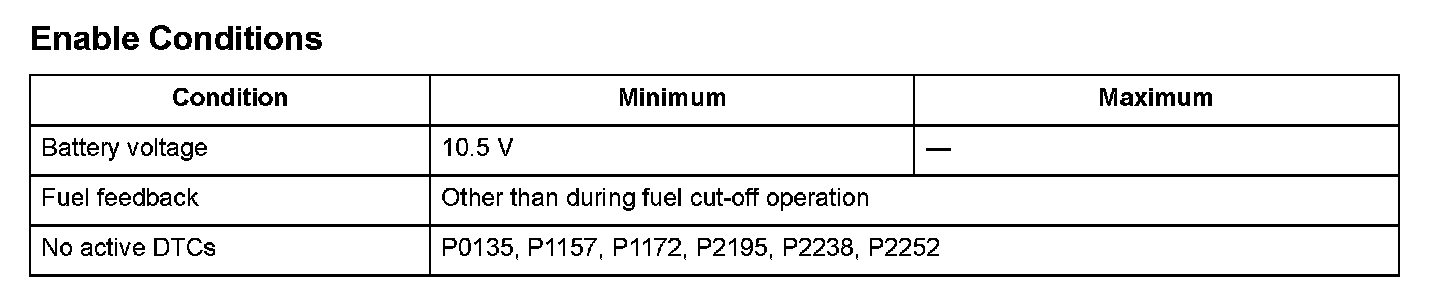 1. When the A/F sensor does not activate in a set time after the A/F sensor heater is turned on (with high A/F sensor internal resistance), a Malfunction of the A/F sensor heater is detected, and a DTC is stored.
