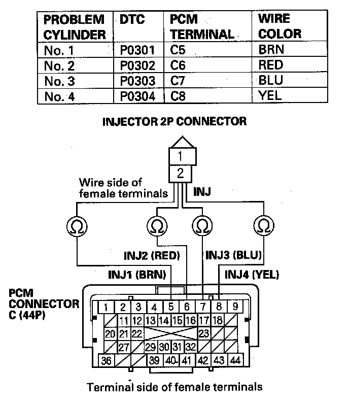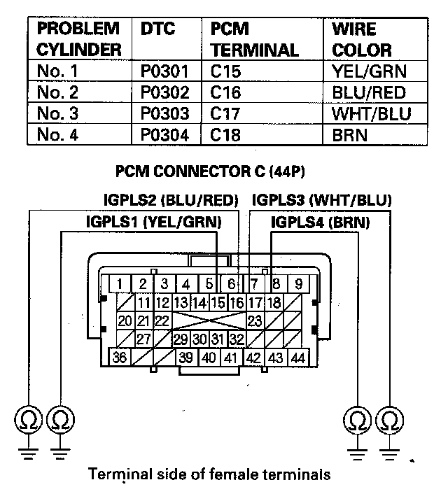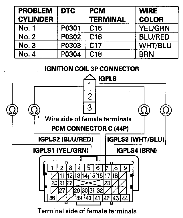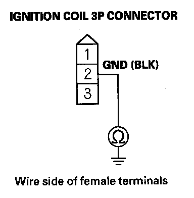 38. Check for continuity between appropriate ignition coil 3P connector terminal No. 1 and the appropriate PCM connector terminal of the problem cylinder.