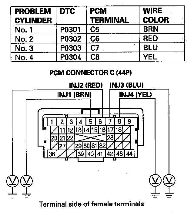 46. Measure voltage between body ground and the appropriate PCM connector terminal of the problem cylinder.