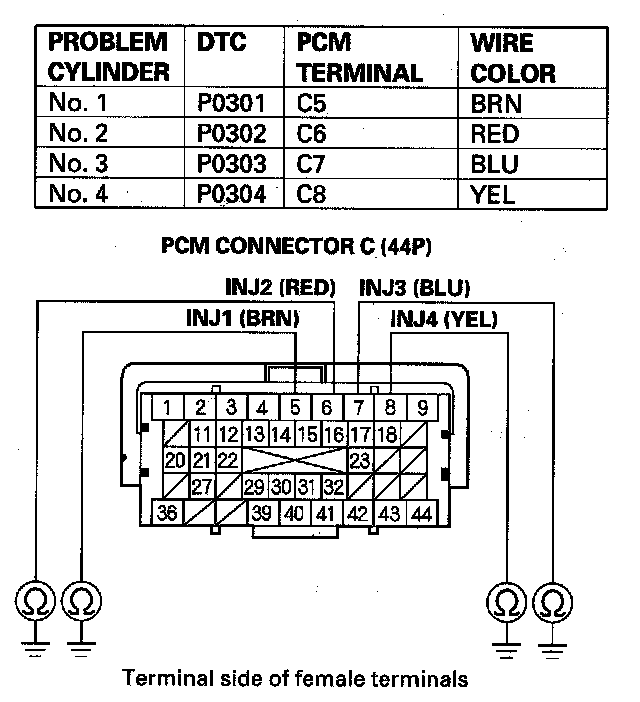 52. Check for continuity between body ground and the appropriate PCM connector terminal of the problem cylinder.
