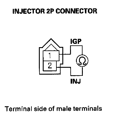 54. At the injector side, measure resistance between injector 2P connector terminals No. 1 and No. 2.