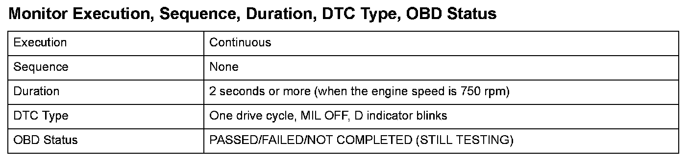 Monitor Execution, Sequence, Duration, DTC Type, OBD Status