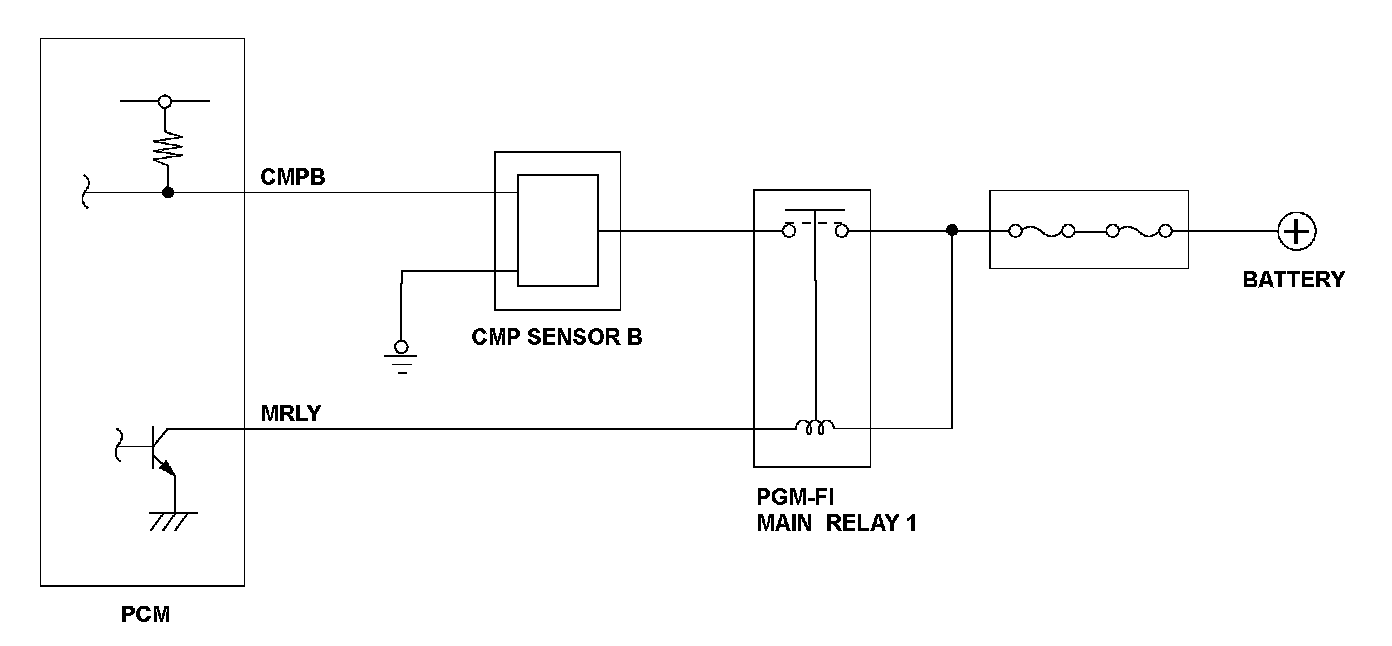 Camshaft position (CMP) sensor B consists of a rotor and a semiconductor that detects rotor position. When the rotor turns after starting the engine, the changes of magnetic flux in the semiconductor are converted into pulsing signals to the powertrain control module (PCM). CMP sensor B detects the top dead center of each cylinder for fuel injection timing. If no CMP sensor B pulsing signals are detected, a Malfunction is detected and a DTC is stored.