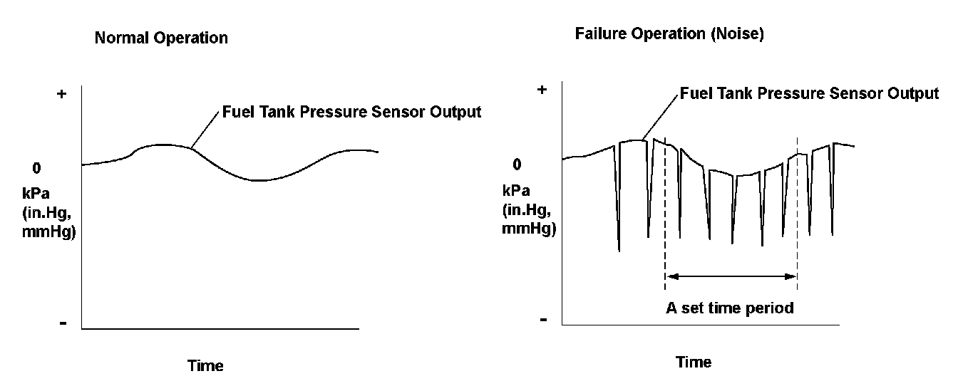 The fuel tank pressure (FTP) sensor is installed on the evaporative emission (EVAP) canister. The FTP sensor is used to detect leaks in the EVAP system. The power train control module (PCM) monitors the FTP sensor output voltage. The FTP sensor output voltage rises as the fuel tank pressure increases. Conversely, the FTP sensor output voltage drops as the fuel tank pressure decreases. Rapid changes in the FTP sensor output voltage due to electrical noise or an intermittent open during the EVAP leak detection may cause incorrect leak detection, so abnormal output is monitored.