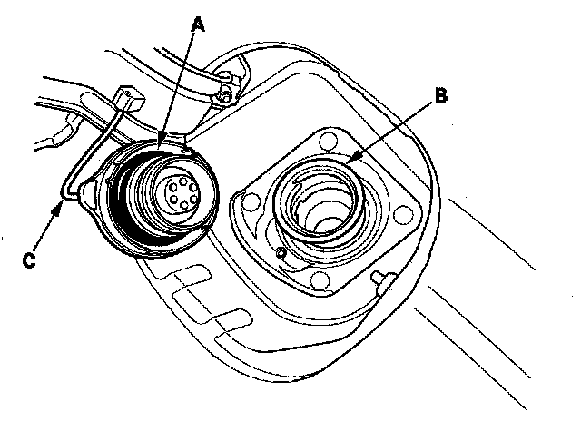 2. Check the fuel fill cap seal (A) and the fuel fill pipe mating surface (B). Verify that the fuel fill cap tether cord (C) is not caught under the cap.