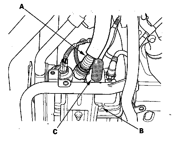 15. Disconnect the fresh air hose (A) from the EVAP canister (B), and plug the EVAP canister port (C).