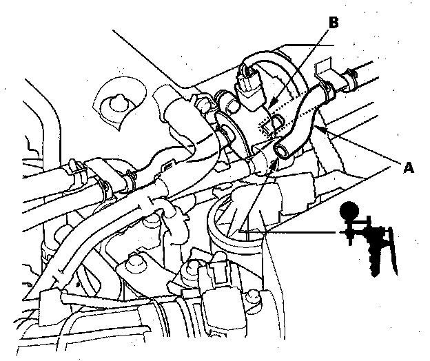 9. Disconnect the vacuum hose (purge line) (A) from the EVAP canister purge valve (B) in the engine compartment, and connect a vacuum pump/gauge, 0 - 30 in.Hg, to the vacuum hose as shown.