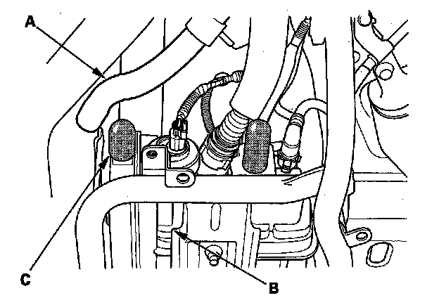 8. Disconnect the fuel tank vapor recirculation tube (A) from the EVAP canister (B), and plug the EVAP canister port (C).