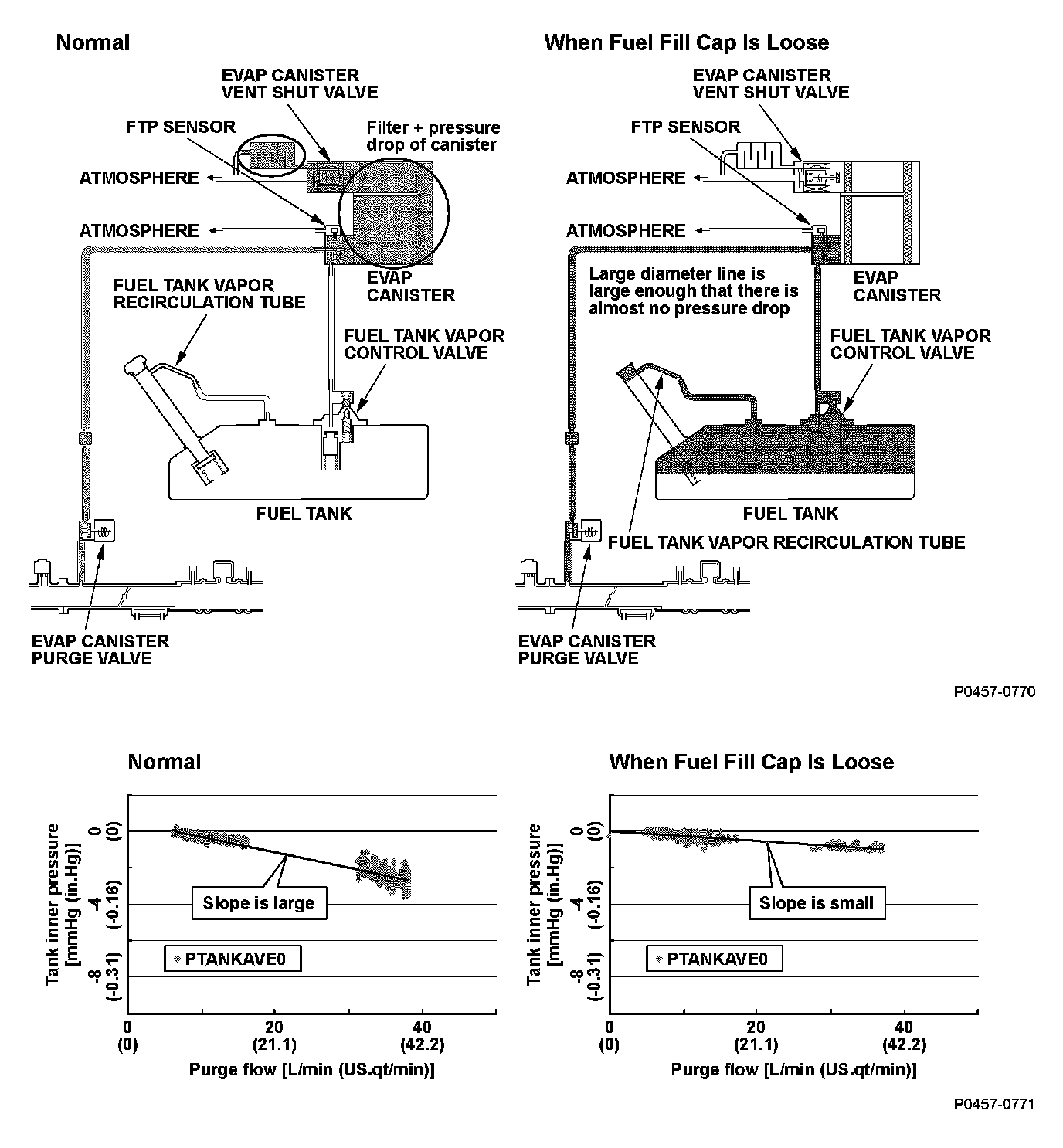 When the fuel fill cap is installed properly, the purge flow occurs due to the airflow resistance of the canister, and tank pressure will be reduced.