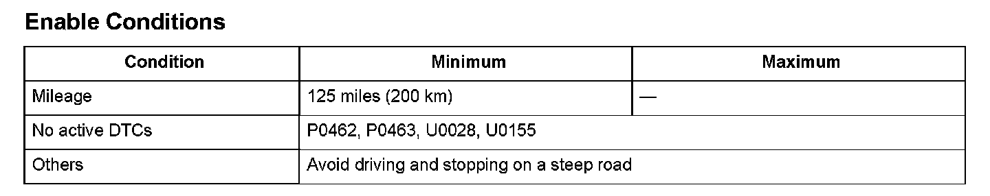 Drive for the specified mileage under Enable Conditions without refueling (turning the ignition switch off is acceptable).