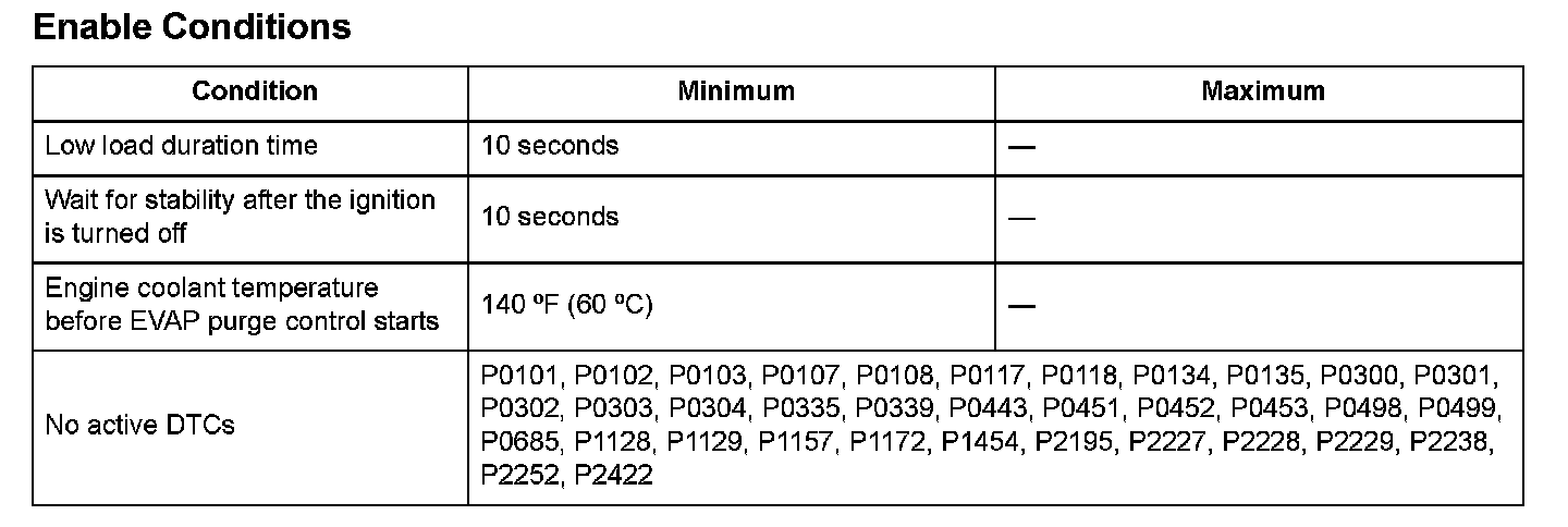 The output from the EVAP canister purge valve is 0.2 kPa (0.07 in.Hg, 2 mmHg) or more for at least 10 seconds.