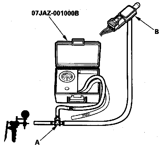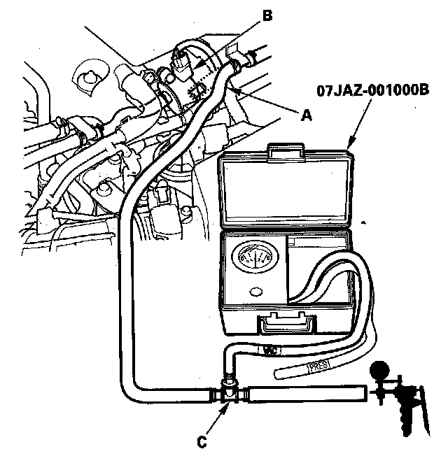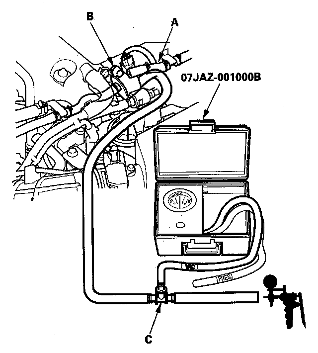 19. Disconnect the vacuum hose (purge line) (A) from the EVAP canister purge valve (B), and connect a T-fitting (C) from the vacuum gauge and the vacuum pump/gauge, 0 - 30 in.Hg, to the hose as shown.